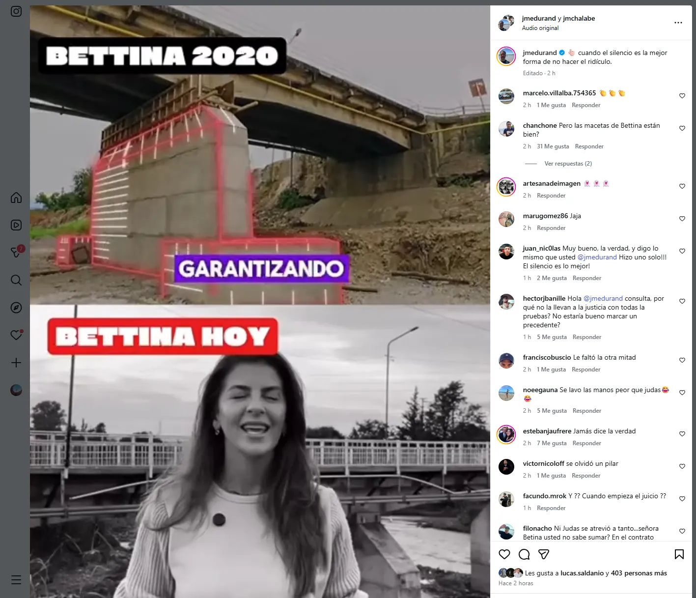 “¿Cuál de las dos Bettina miente?” criticó el intendente en su video. Así, eligió responder a la ex intendenta que arrastró cientos de comentarios en contra de ella por una obra que podría haber sido una tragedia.